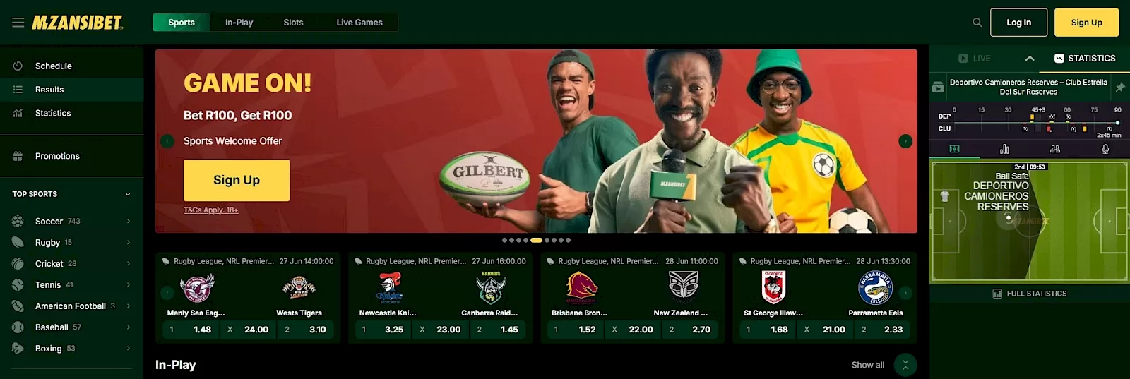 Mzansibet revitalises South Africa’s online betting with a clean interface and the backing of SMS2Bet’s 30 years of experience. It emphasises soccer, cricket, rugby, tennis and other top sports, offering competitive odds and low margins for added value. Live betting comes alive with real time stats and clear infographics, though streaming isn’t provided.